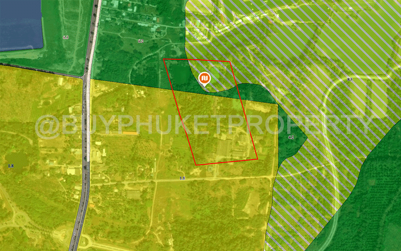 | | Large vacant land for sale near Bumrungrad International Hospital in Thalang District, Phuket, measuring 147,324 SQM equivalent to 92.39 rai in total. The plot is designated within the yellow, green and white stripe green city plan zone, allowing building heights between 6- 23 meter and completed with public utilities, road access, electric city, and water supply |